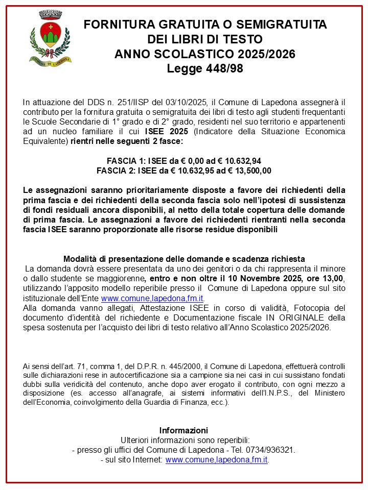 In attuazione del DDS n. 251/IISP del 03/10/2025, il Comune di Lapedona assegnerà il contributo per la fornitura gratuita o semigratuita dei libri di testo agli studenti frequentanti le Scuole Secondarie di 1° grado e di 2° grado, residenti nel suo territorio e appartenenti ad un nucleo familiare il cui ISEE 2025 (Indicatore della Situazione Economica Equivalente) rientri nelle seguenti 2 fasce: