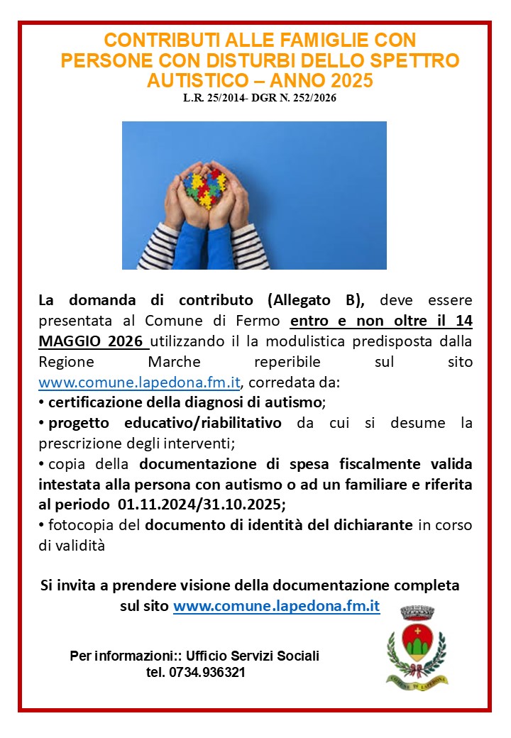 Con la deliberazione n.252 del 16.03.2026 la Giunta regionale ha approvato i criteri e modalità per l’assegnazione del finanziamento destinato agli Enti capofila degli Ambiti Territoriali Sociali (ATS) per l’intervento di cui all’art. 11 della L.R. n. 25/2014 rivolto alle famiglie con persone con disturbi dello spettro autistico residenti nella Regione Marche che effettuano interventi educativi/riabilitativi basati sui metodi riconosciuti dall’Istituto Superiore della Sanità e contestualmente ha stanziato l’importo di € 250.000,00 per l’attuazione dell’intervento stesso.